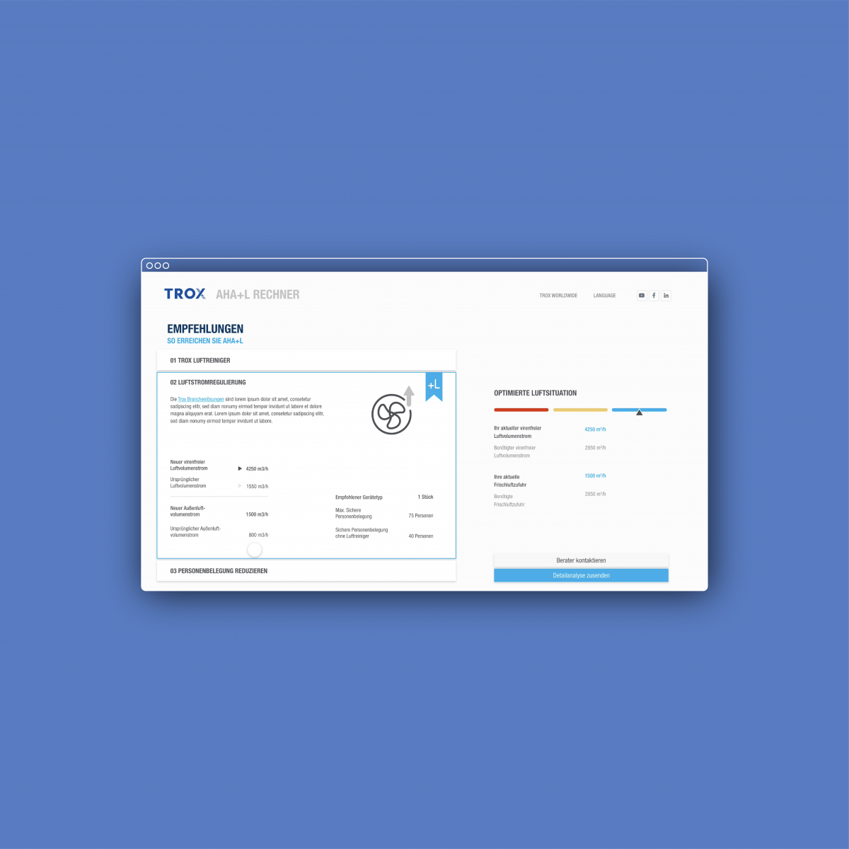 The B2B environment is traditionally the main market for TROX, a leading manufacturer of ventilation systems. However, with the TROX AIR PURIFIER, which we designed, the company has reached new customer segments such as schools and restaurants. To best address these target groups, we developed the TROX AHA+L calculator, a ventilation capacity validation tool to help people ensure a safe environment.